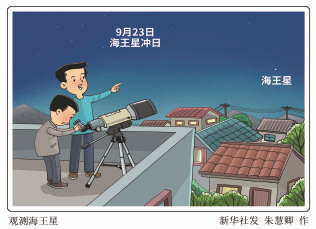 新华社天津电(记者 周润健)继9月21日的土星冲日之后,海王星也将于9月23日迎来冲日。冲日时,海王星距离地球最近、视直径最大、亮度最高,是观测它的最佳时机。天文科普专家提醒,冲日前后的这段时间,感兴趣且有条件的公众可以借助口径10厘米以上的天文望远镜,试着找一找这颗太阳系中距离太阳最远的行星。