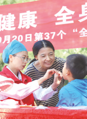 在河北省唐山市丰润区燕山路街道燕山第三社区,丰润区第二人民医院口腔科医生为小朋友检查牙齿。9月20日是全国爱牙日,今年的主题为“口腔健康,全身健康”。连日来,各地中小学、幼儿园、社区开展各类爱牙护牙主题教育宣传活动。