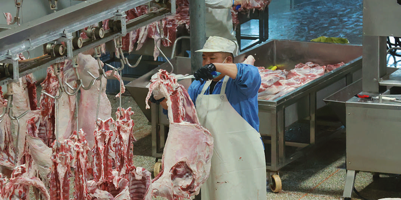离开生食区,没到地方就能闻到熟食加工区飘来的肉香味儿。车间里,煮肉的大锅里汤底翻滚,雾气升腾,空气里调料味的辛香与肉香交织,让人不禁口齿生津。工人们穿着粉色制服,匆忙有序地开展工作。远处传来切割熟肉的砧板声,混合着包装机的运转声,构成车间特有的节奏。