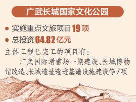 目前,广武长城国家文化公园已实施重点文旅项目19项,总投资64.82亿元。主体工程已完工的项目有广武国际滑雪场一期建设、长城博物馆改造、长城遗址遗迹基础设施建设等7项,总投资8.38亿元。在建项目广武国际滑雪场二、三期建设、山地户外营地运动设施等6项,总投资17.06亿元。此外,新广武三段长城展示利用等储备项目6项,总投资39.38亿元。
