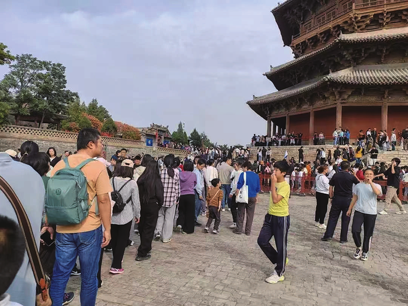 “双节”假期,应县木塔景区迎来旅游高峰。这座被誉为“斗拱博物馆”的古建筑,以其无钉无铆的建筑奇迹和深厚的文化底蕴,成为假期里最具吸引力的文化地标。景区内,导游们拿着扩音器讲解木塔的历史故事,周围围满了认真聆听的游客。游客们一边欣赏古塔风韵,一边品味悠久历史文化。
