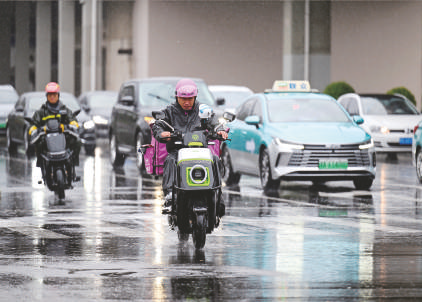 10月9日,在天津市南开区,骑手和车辆在雨中行驶。
