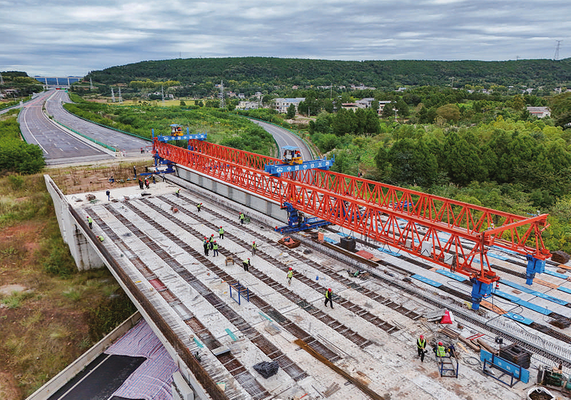 这是京昆高速广元至绵阳段扩容工程牛头河大桥架梁作业现场(无人机照片)。10月12日,由中铁五局承建的京昆高速广元至绵阳段扩容工程牛头河大桥完成最后一片T梁架设,标志绵阳段完成全部架梁,为全线建成通车奠定坚实基础。京昆高速广元至绵阳段扩容工程建成后,将使贯穿川陕的骨干公路流量进一步提升,使其成为成渝地区乃至我国西南地区通往华中华北、京津冀的又一条快捷通道。 新华社记者 王曦 摄