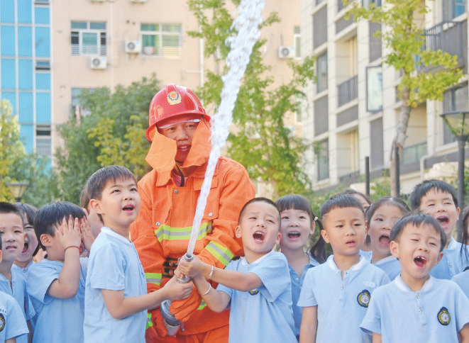 10月13日,浙江省台州市仙居县中心幼儿园微型消防站工作人员为仙居县中心幼儿园的孩子们演示消防水枪使用方法。10月13日是国际减灾日,各地开展防灾减灾知识普及和应急疏散演练等活动,以提高市民应急避险与安全自救能力。 新华社发 王华斌 摄