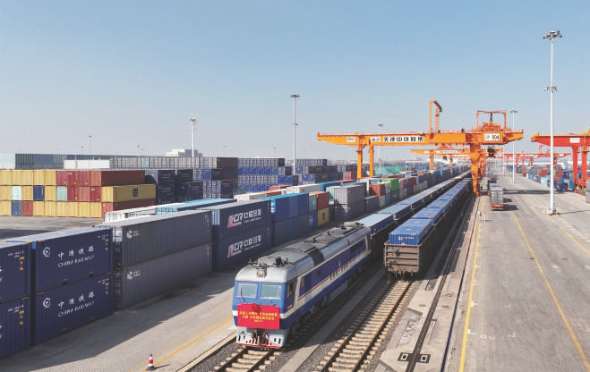 10月13日拍摄的天津-中亚图定班列首发现场。10月13日,伴随嘹亮悠长的鸣笛声,一列满载家电产品、汽车配件等货物的中亚班列从中铁天津集装箱中心站出发,将经由霍尔果斯口岸出境,驶向哈萨克斯坦等地。 新华社记者 李然 摄