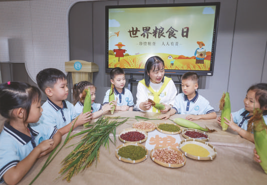 10 月 14日,浙江省湖州市吴兴区东林镇中心幼儿园的老师带着孩子们开展世界粮食日主题课程,了解各类粮食知识。