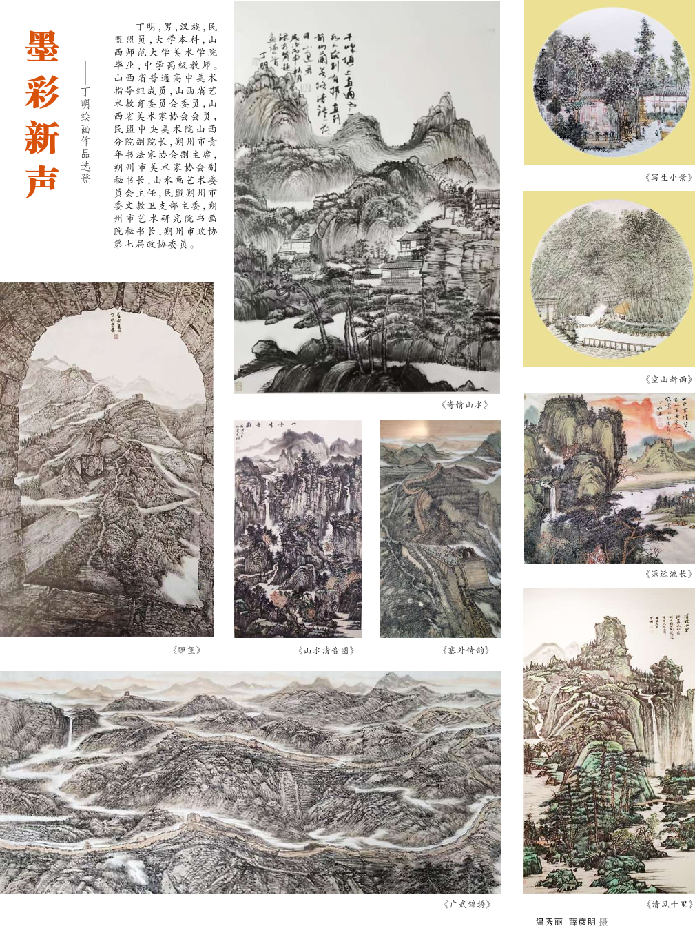 丁明,男,汉族,民盟盟员,大学本科,山西师范大学美术学院毕业,中学高级教师。山西省普通高中美术指导组成员,山西省艺术教育委员会委员,山西省美术家协会会员,民盟中央美术院山西分院副院长,朔州市青年书法家协会副主席,朔州市美术家协会副秘书长,山水画艺术委员会主任,民盟朔州市委文教卫支部主委,朔州市艺术研究院书画院秘书长,朔州市政协第七届政协委员。