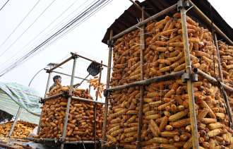 10月11日,山西省运城市新绛县泽掌镇泽掌村村民抓紧降雨暂停时段将收获的玉米上架晾晒。近日,多地遭遇阴雨天气,农民抢抓农时,抢收、抢烘秋粮。