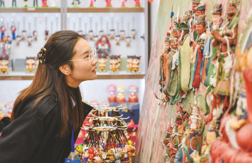 10月21日,游客在忻州古城参观非遗面塑作品。