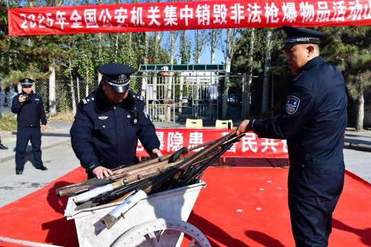 近日,市公安局组织开展2025年集中销毁非法枪爆物品活动,对今年以来收缴的42支非法枪支及零部件统一销毁。图为公安民警将收缴的各类非法枪支集中展示后进行销毁。此次集中销毁的42支非法枪支主要来源于公安机关在案件侦办、日常检查以及群众主动上缴等途径。