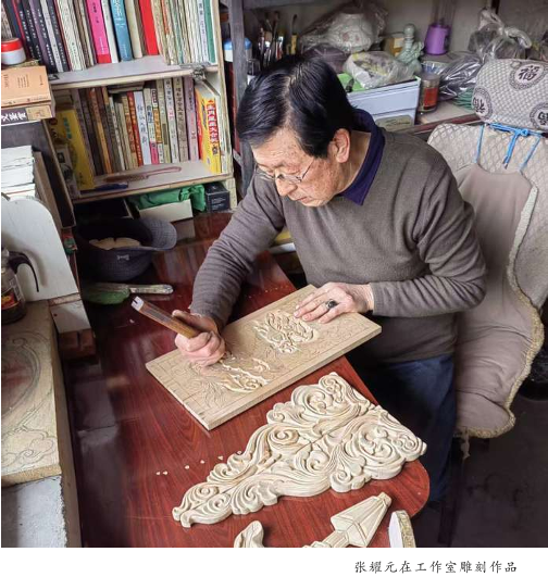 走进张耀元的工作室,仿佛踏入了一个时光交错的艺术殿堂。木屑的清香在空气中弥漫,墙上挂满各式刻刀,工作台上散落着未完的作品。面容清癯的张耀元正俯身于一块木料前,手中的刻刀游走自如,每一次起落都带着岁月的韵律。