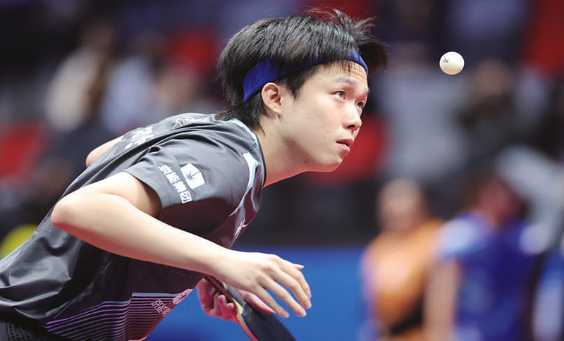 11月17日,北京队选手王楚钦在比赛中发球。他3比1战胜江苏队选手孙闻。