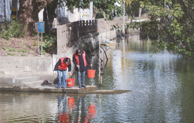 11月25日,和平镇长城村党员志愿者在河岸旁清理漂浮物。