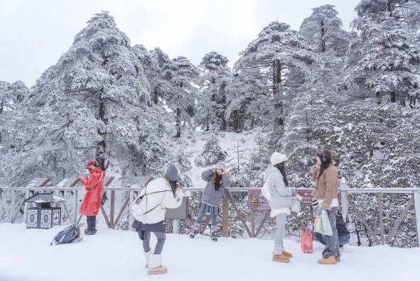 11月24日,游客在云南大理苍山景区雪景中拍照留念。