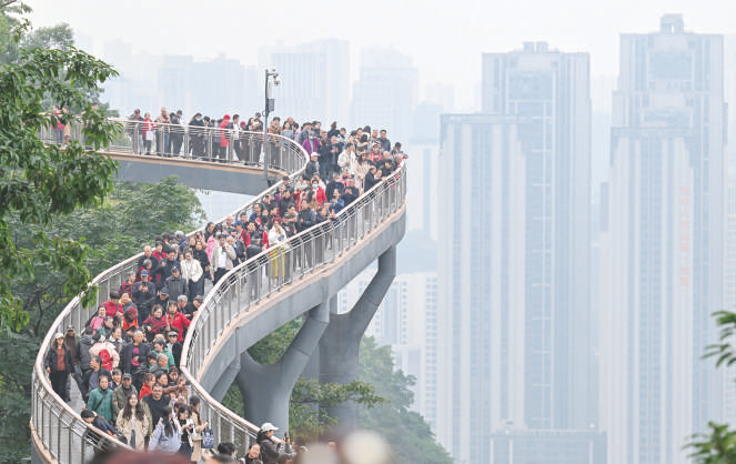 11月24日,人们在重庆半山崖线鹅岭栈桥观光。近日,重庆半山崖线鹅岭栈桥正式对外开放。该栈桥全长460米,宽3米,最高处距地面28米,依天然崖壁而建,将鹅岭公园与佛图关公园连为一体,独特的观江视野使其成为重庆旅游观光的新晋地标。 新华社记者 陈诚 摄