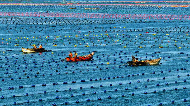 11月19日,在山东省荣成市爱伦湾海带养殖区,工人进行海带播苗作业(无人机照片)。眼下,山东省荣成市海带播苗作业全面展开,养殖工人们抓紧时间进行夹苗、播苗等作业。