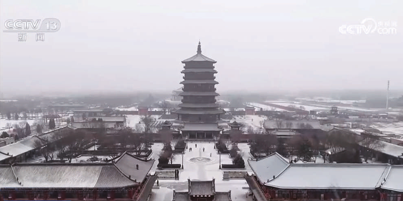 近日,山西朔州迎来入冬以来最强的一次降雪过程。在应县木塔景区,洁白的雪花从空中飘落,覆盖在木塔的斗拱飞檐间。