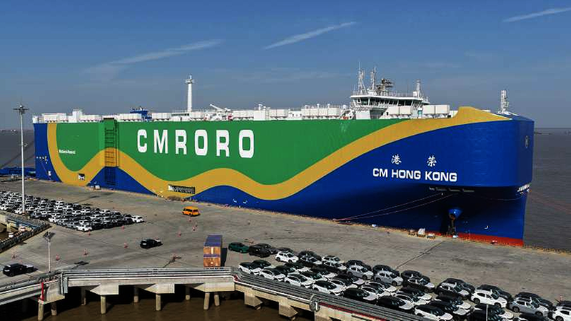 12月9日,在江苏省苏州港太仓港区,“港荣”号甲醇双燃料动力滚装船在装载出口汽车(无人机照片)。