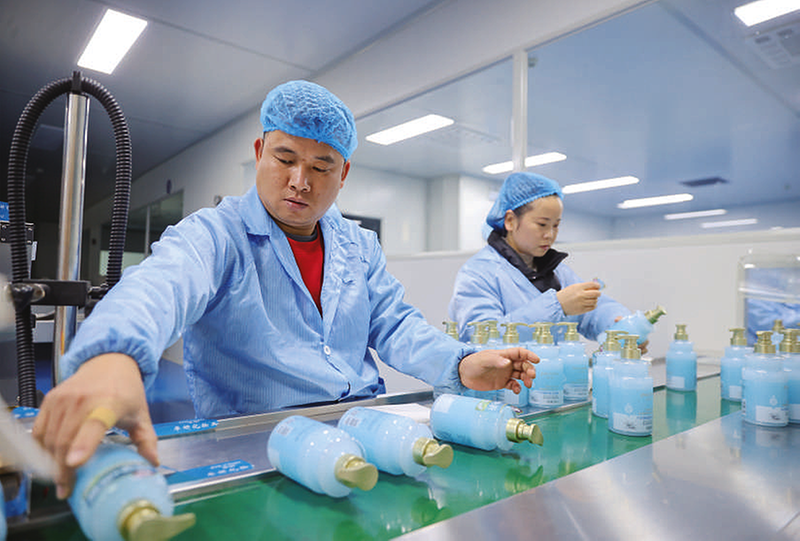 1月5日,浙江省湖州市吴兴区埭溪镇一家化妆品生产企业工人在赶制产品订单。