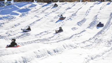 1月11日,游客在河北省唐山市迁西县凤凰山景区冰雪乐园坐雪圈滑雪。