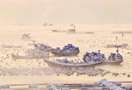 1月12日,雪后的山东省荣成市爱伦湾海洋牧场出现“海浩”景观。据悉,“海浩”景观是一种在严寒天气下出现的自然奇观,表现为海面或湖面上水汽蒸发后遇冷凝结,形成白茫茫的雾气,如同水面沸腾一般。
