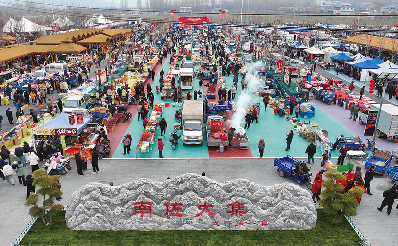 图为人们在河北省元氏县南佐大集上选购商品(无人机照片)。寒冬时节,被誉为“太行第一集”的河北省元氏县南佐大集热闹非凡,琳琅满目的山货、农副产品等商品让人目不暇接,吸引周边群众前来采购年货、品尝美食,感受浓浓的烟火气息。 新华社发 梁子栋 摄
