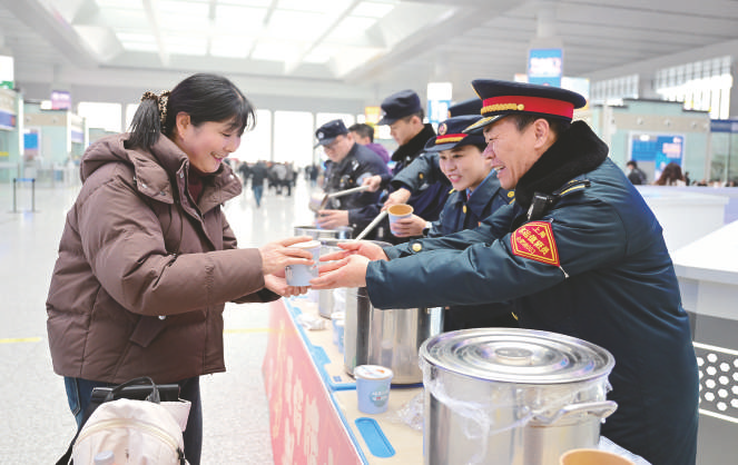 1月25日,在合肥南站候车大厅,工作人员将腊八粥送给旅客。