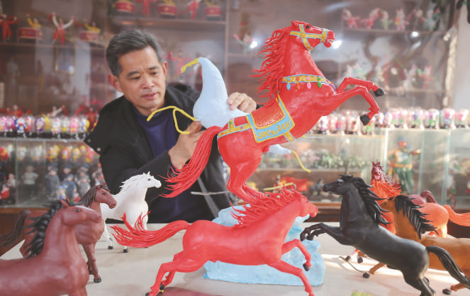 在山东省临沂市沂南县红石寨非物质文化遗产博物馆,面塑艺人左安胜在创作面塑作品“赤马踏春”。腊八过后就是年。在山东各地,以“马”为主题的文化创意产品正如火如荼地涌现,从博物馆的文物衍生品到非遗工坊的手作精品,从传统玩具到现代文创,各种“马”元素产品琳琅满目,共同奏响一曲新春文化交响乐。 新华社发 王彦冰 摄