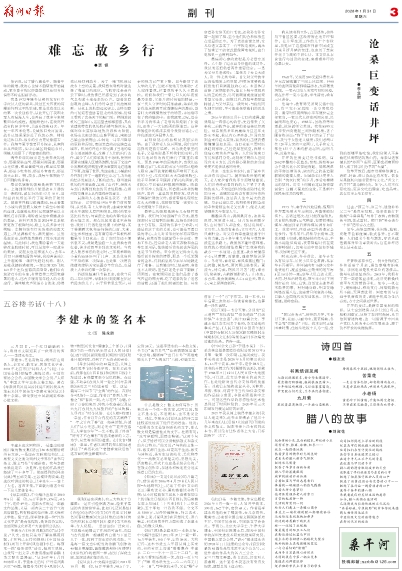 《说江湖》是李建永的一本杂文集,中央编译出版社2011年10月一版一印,16开平装本,105千字,定价38元。大约记得,这本书是五六年前从网上买来的,书的衬页上写着“珊珊惠存 李建永 二○一一年十一月二十二日”。建永先生看到后微微一笑,在同一页上写下了“赠 陈永胜先生,二○二六年元月二十二日”,写毕意犹未尽,又在“赠”字前加了一个“再”字作罢。同一本书,15年后第二次给另一位读者来签名,也算是一段佳话吧。