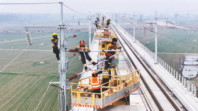 2月1日,在雄商高铁山东菏泽段,中国铁路济南局集团有限公司济南供电段的工作人员对接触网设备进行检查验收。当日,随着中国铁路济南局集团有限公司济南供电段的接触网检修列和作业车入场雄(安)商(丘)高铁菏泽段,雄商高铁山东段进入全面静态验收阶段。