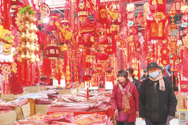 2月3日,市民在河南省开封市鼓楼区一年货市场选购春节饰品。