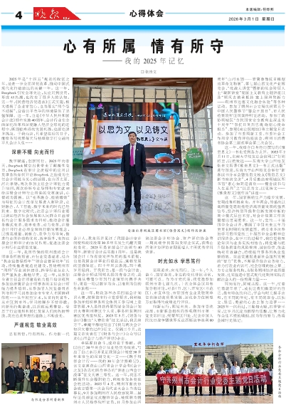 这一年,国家新质生产力稳步发展,宏观政策积极有为。开年两会,传递出以高质量党建助推经济高质量发展的强烈信号,经济转型升级和创新发展中新的商业模式层出不穷,对会计核算工作质量提出更高要求。这一年,党的二十届四中全会召开,擘画了中国未来五年乃至更长时期的发展蓝图。我有幸多次参加学习贯彻党的二十届四中全会精神宣讲报告会,在学习的过程中,我自觉将理论知识与业务实践相结合,将党建与提升服务质量和风险管理、诚信经营、依法纳税有效融合,持续提升事务所执业监督质效。突出党建促进新社会组织发展的“智力”优势,不断提升综合业务能力,着力打造业内认可、社会信赖的独立第三方专业服务机构,为服务朔州经济高质量发展、扎实推进中国式现代化朔州实践贡献注会人的一份绵薄力量……
