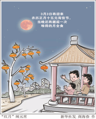 新华社南京电(记者 王珏玢邱冰清)3月3日迎来农历正月十五元宵佳节,今年元宵节不仅正巧迎来正月的满月,当晚还将邂逅一次难得的月全食。一轮“红月亮”将高悬夜空,为元宵佳节增添一份宇宙级别的浪漫。