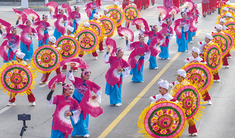 3月3日,人们在河南省三门峡市陕州区陕州大道表演扭秧歌(无人机照片)。
