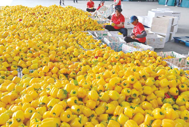 3月12日,工人在广西合浦县沙岗镇北海新佳恒农业技术服务有限公司设施蔬菜种植基地给彩椒装箱。近年来,广西合浦县抢抓“南菜北运”和粤港澳大湾区“菜篮子”供应基地机遇,积极推进设施农业快速发展。全县设施农业种植面积从2020年的0.2万亩迅速拓展到今年初的1.76万亩,年产值超过8.5亿元。