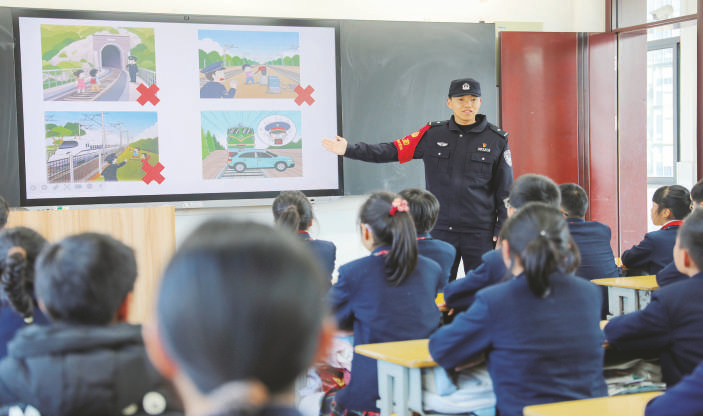 3月13日,合肥铁路公安处黄山站派出所民警在安徽省黄山市黄山育才学校开展铁路安全教育主题活动,普及铁路安全知识,提高师生的安全防范和自我保护意识。 新华社记者 曹力 摄