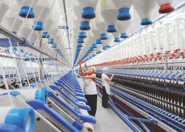 在四川达州高新区南国纺织印染有限公司生产车间,工人赶制出口的棉布订单。