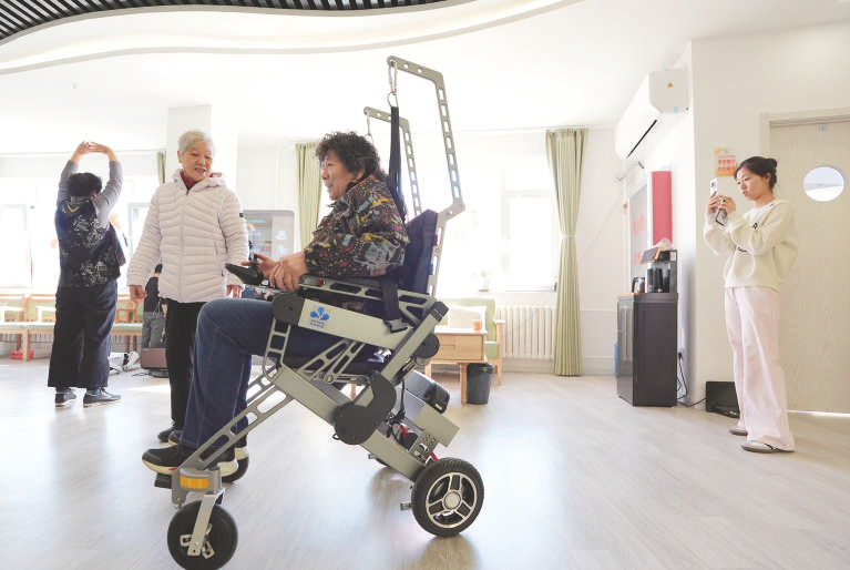 在智慧康养机器人养老驿站内,一名社区居民(前)体验一款智能行走机器人(3月18日摄)。近日,北京市荣华街道智慧康养机器人养老驿站启动运营,这家坐落于社区内的机器人特色养老驿站,使用面积约1100平方米,驿站内包含基础服务、机器人应用、适老化改造等三大场景。截至目前已部署24家企业超40款机器人产品,打造了集服务、试验、数据采集、信息反馈于一体的创新养老模式,也为社区居民提供了机器人场景沉浸式体验。