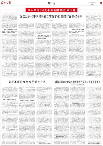 发展新时代中国特色社会主义文化是一项系统工程,需要从理论构建、实践探索到制度保障等多方面协同推进。《习近平谈治国理政》第五卷中对加快建设文化强国进行了重要论述。其中,《加快建设文化强国》指出,“我们要锚定2035年建成文化强国的战略目标,坚持马克思主义这一根本指导思想,植根博大精深的中华文明,顺应信息技术发展潮流,不断发展具有强大思想引领力、精神凝聚力、价值感召力、国际影响力的新时代中国特色社会主义文化,不断增强人民精神力量,筑牢强国建设、民族复兴的文化根基。”这一重要论述,指明了发展新时代中国特色社会主义文化的具体落实和有效路径。