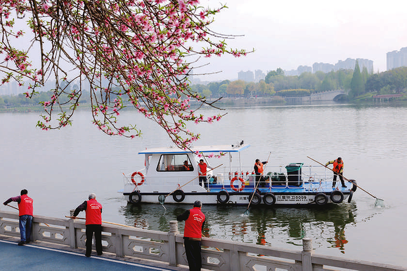 3月 21日,在四川省眉山市东坡区东坡湖,志愿者和环卫工人在进行湖面清漂作业。