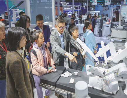 3月29日,在2026中国医学装备展览会现场,工作人员为观众讲解分体式手术机器人工作原理。