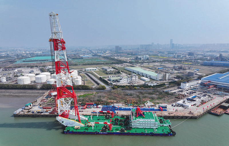 在江苏南通拍摄的156米动力定位打桩船“铁建大桥桩1”号。3月31日,156米动力定位打桩船“铁建大桥桩1”号在江苏南通顺利交付。据介绍,该船由中国铁建大桥局投资建造,总长130.5米,宽40.8米,型深8.4米,桩架高度156米,作业水深最深70米,可打直径7米、桩重700吨的桩基。作为兼具先进动力定位系统与三项世界级性能指标的打桩船,“铁建大桥桩1”号的交付,标志着我国在复杂海洋环境下实施大型、超深、高精度桩基施工的核心装备能力迈上新台阶,将为国内外大型跨海桥梁、风电、港口、码头建设以及深远海工程提供一流装备保障。 新华社记者 季春鹏 摄