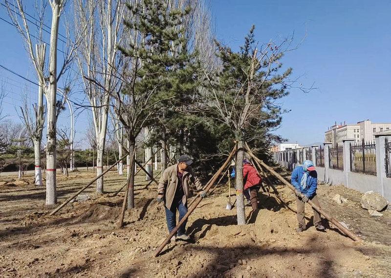 为配合道路升级改造工程,朔州经济开发区相关部门组织开展街道绿化树木移植工作,将文远路部分绿植有序移栽至康泰路。图为园林工作人员正为移植树木进行扶直、加固及灌溉养护。 张建花 摄