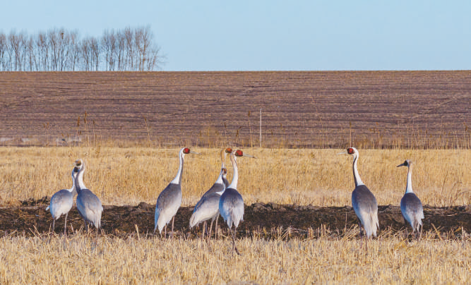 这是4月1日在黑龙江省肇东市千鹤岛旅游风景区拍摄的白枕鹤。