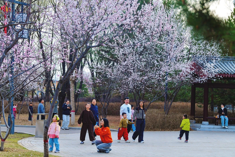 4月3日,市区敬德公园阳光明媚、万树花开,芬芳与美景交织相融,描绘出一幅春意盎然的生态画卷。图为市民流连其中,赏花游玩、拍照打卡。 李小龙 摄