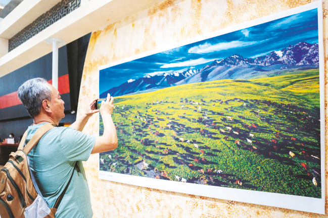 观众在湖南省博物馆参观“我的吐鲁番”摄影展时拍照。4月9日,“我的吐鲁番”摄影展在湖南省博物馆开幕。展览通过上百幅照片展现了新疆吐鲁番的风土人情、历史底蕴与时代风貌,生动讲述了湖南省对口支援吐鲁番市二十八年来,两地人民心手相连、共同发展的深情厚谊。 新华社记者 陈思汗 摄
