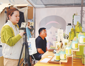 在上海丰盛里·静安寺广场的咖啡文化市集上,咖啡品牌的工作人员直播卖货。4月8日起,为期5天的“2026上海静安咖啡文化系列活动”在上海静安寺商圈举行。
